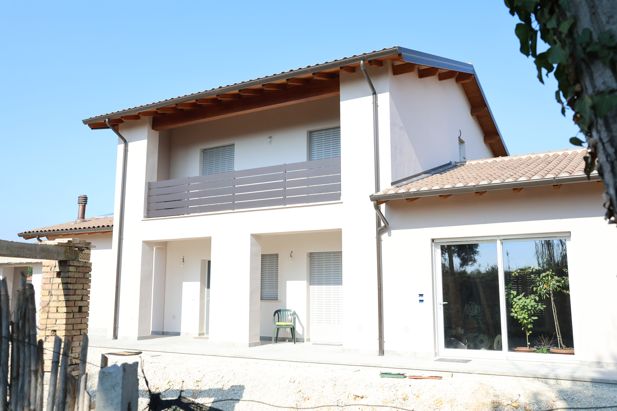 Struttura in cemento armato con tamponature in laterizio e copertura a falde con manto in coppi, dotata di impianto fotovoltaico integrato.